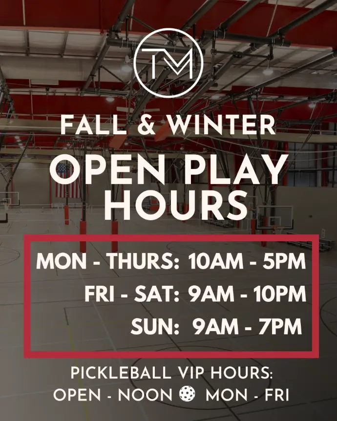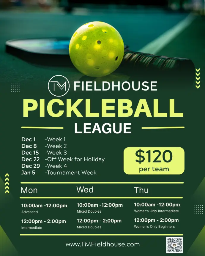 Get ready for 5 weeks of exciting pickleball action at TM Fieldhouse! Whether you’re new to the game or a seasoned player, our league is built for all levels of play — offering fun, competition, and community.